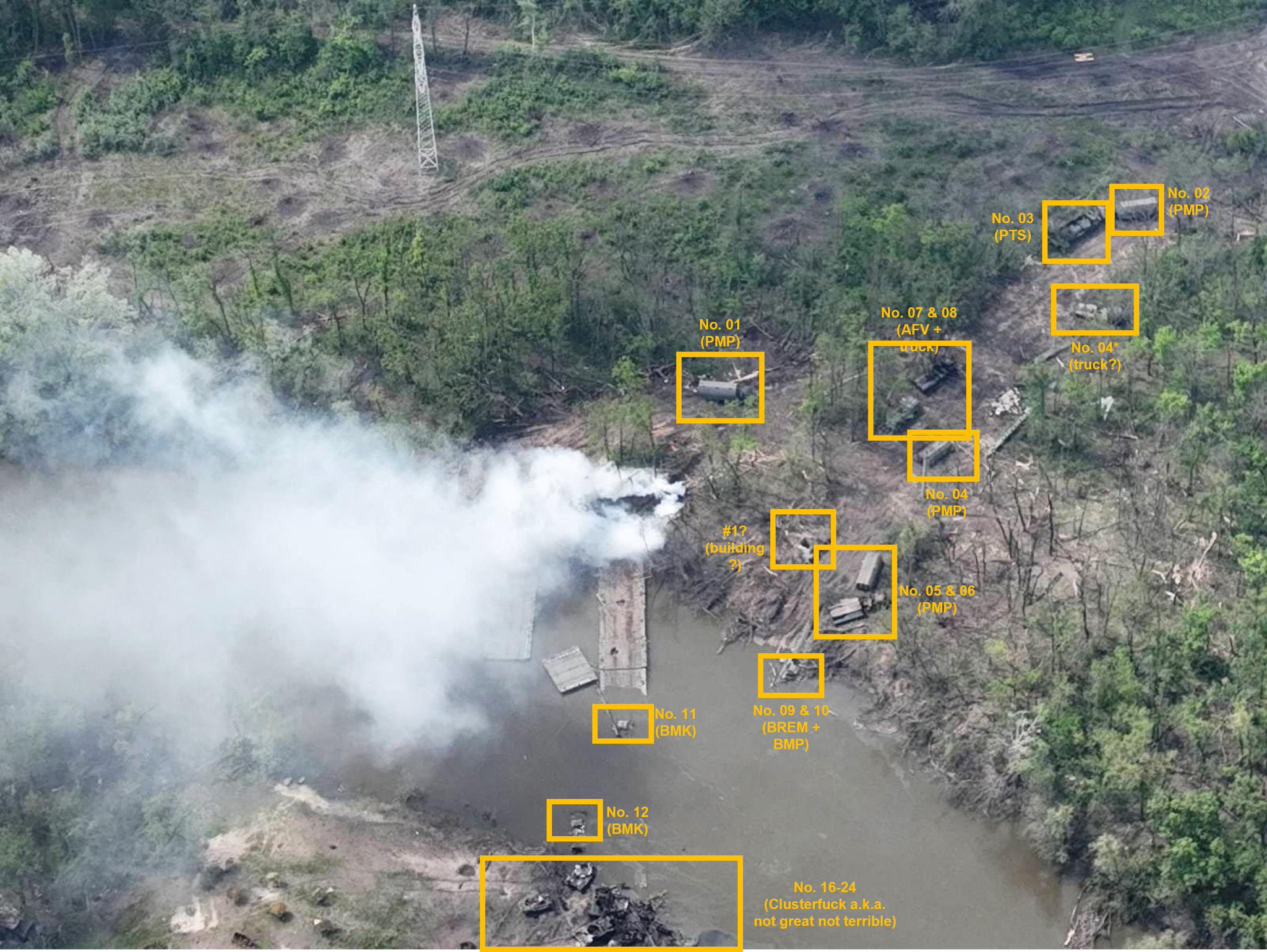 За четыре дня Россия потеряла или бросила 73 единицы военной техники в результате неудачной переправы через реку Северский Донец в районе Белогоровки. Это выяснил расследователь BlueSauron, занимающийся освещением военных конфликтов на основе открытых данных.