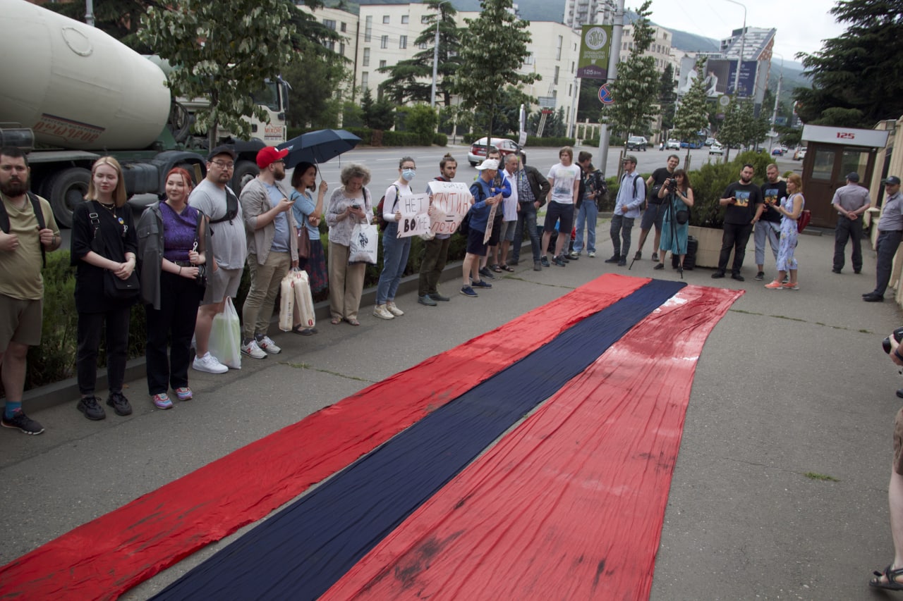 В Тбилиси активисты вынесли на площадь российский триколор, где белый цвет был залит красной краской, имитирующей кровь.