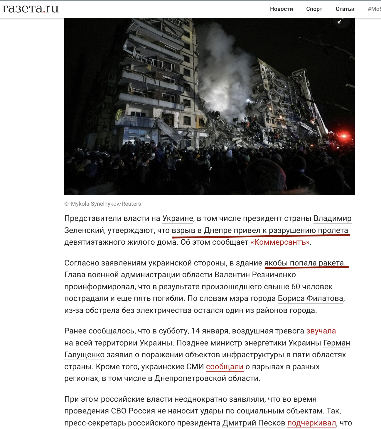Российские государственные СМИ РИА «Новости» и ТАСС не опубликовали ни одной новости о том, что РФ ударила ракетой по жилому дому в Днепре, нет ни одного материала о случившемся, даже просто упоминания о разрушении части дома. В результате удара погибло уже девять человек, свыше 60 пострадали. Однако об этом не написало ни одно из государственных изданий. Не посвятило этому ни строчки также издание «Вести» (входит в холдинг ВГТРК). Не было публикаций и у НТВ («Газпром-Медиа»).