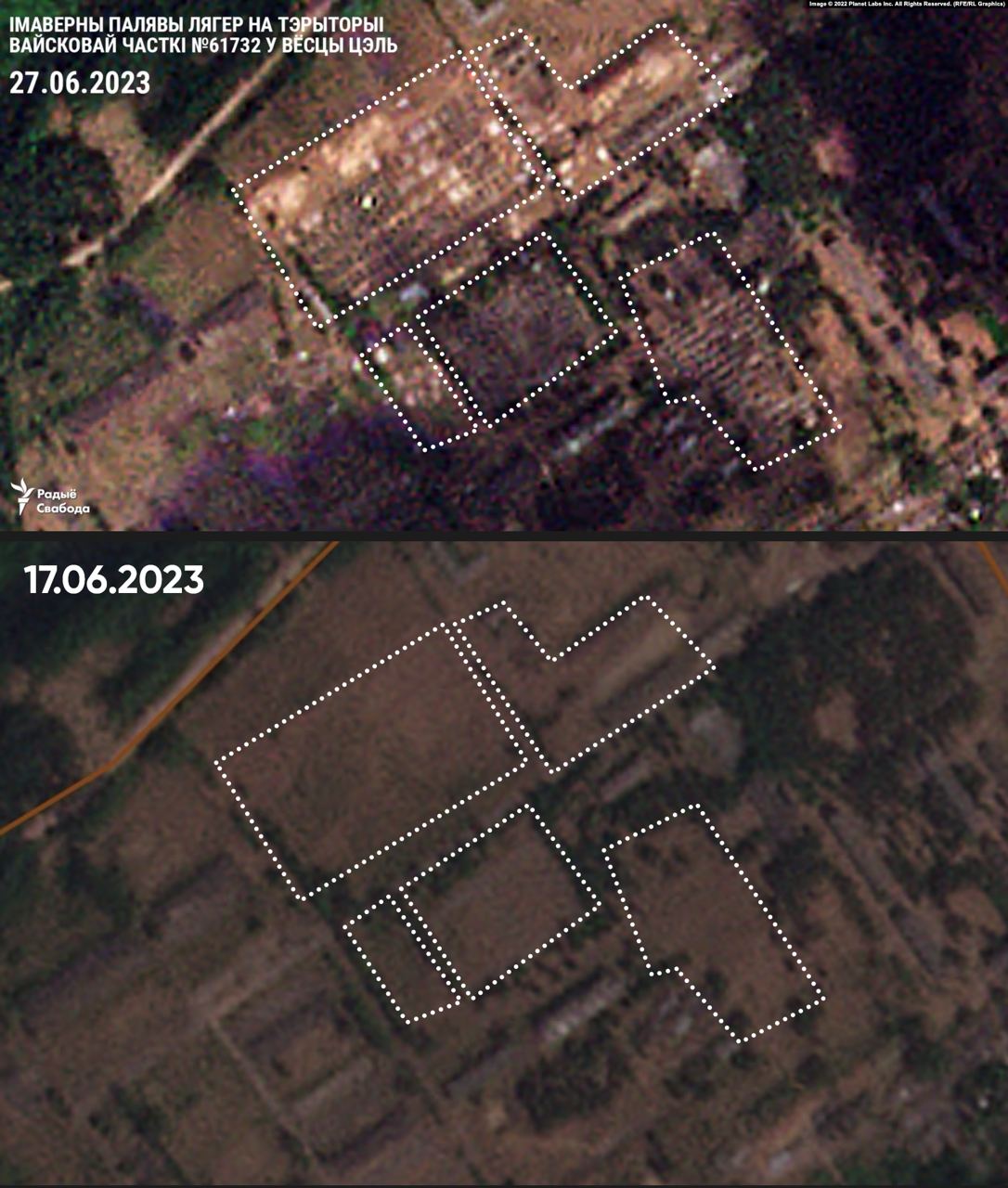 Более детализированные снимки за 27 июня опубликовало «Радыё свабода». На них видно, что в воинской части присутствуют повторяющиеся объекты. Это могут быть как палатки, так и техника. В самой крупной области изображения можно заметить минимум 6,5 ряда по 20 объектов, то есть в сумме 130. Если это крупные палатки, то в одной может быть до 50 человек, соответственно, лагерь способен вместить примерно 6500 человек.