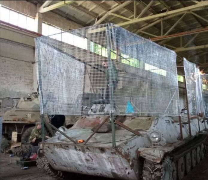 Россияне продолжают упражняться в создании противодроновых сеток на бронетехнике — в этот раз танк Т-72Б укрыли почти полностью. Отмечается, что конструкция приварена к корпусу, а не к башне, что, соответственно, сильно ограничивает угол поворота последней.