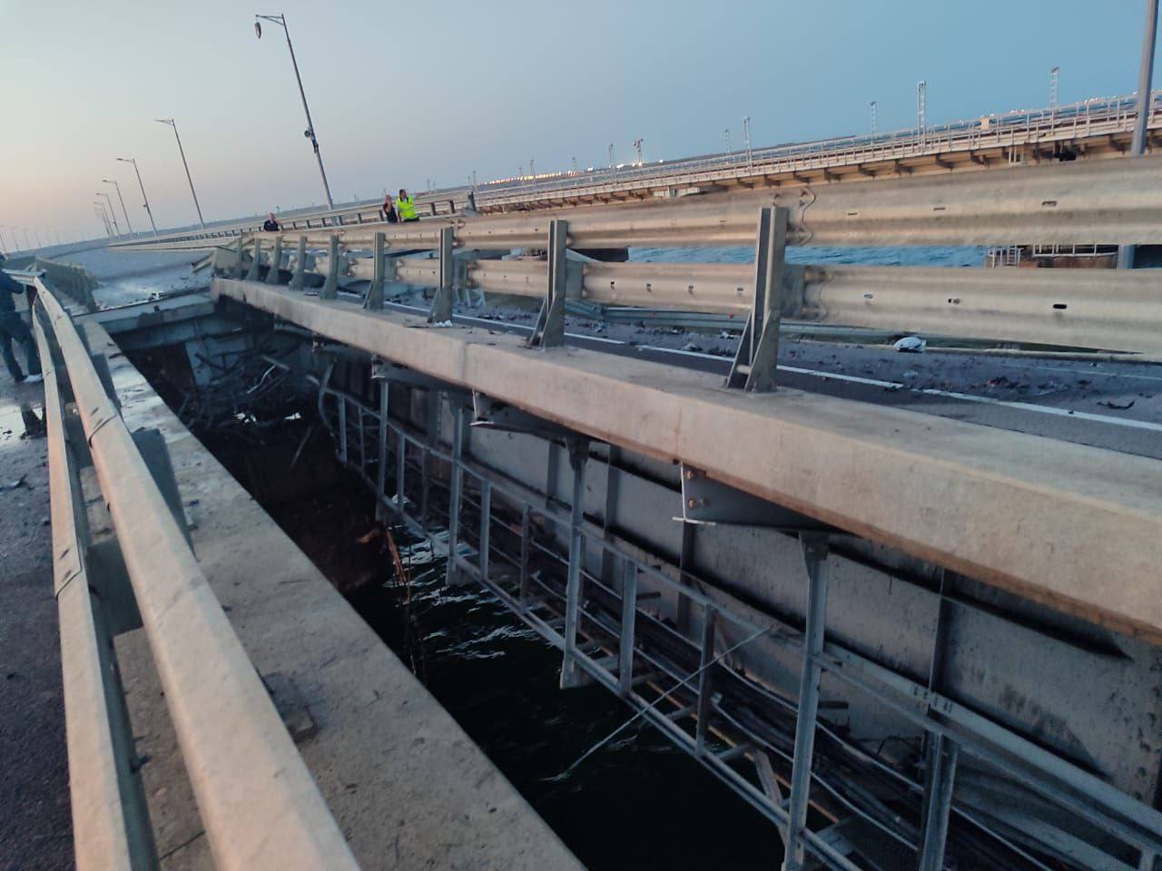 Национальный антитеррористический комитет (НАК) России сообщил, что атака на Крымский мост совершена двумя украинскими беспилотными надводными аппаратами. Об атаке надводными БПЛА сообщали ранее утром и пропагандистские Telegram-каналы, в том числе «Военный обозреватель». В соцсетях публикуют фото и видео повреждений моста.
