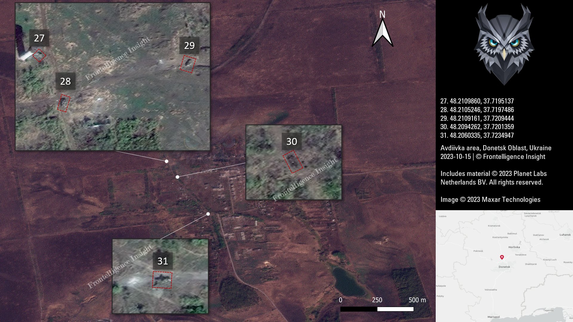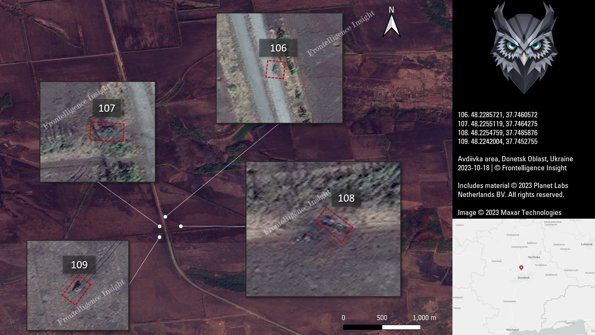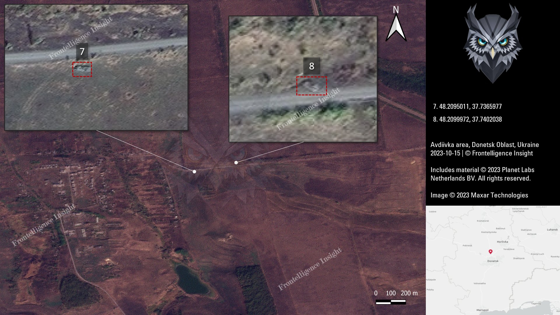 Офицер ВСУ, пишущий под ником Tatarigami_UA, анализирует ситуацию под Авдеевкой при помощи спутниковых снимков. По его данным, в период с 10 по 20 октября российские силы потеряли в этом районе 109 единиц военной техники. Подавляющее большинство потерь приходится на боевые бронированные машины, в том числе БМП-1 и БМП-2, танки Т-72, ​​Т-64 и Т-80 в различных модификациях, МТ-ЛБ и БТР.
