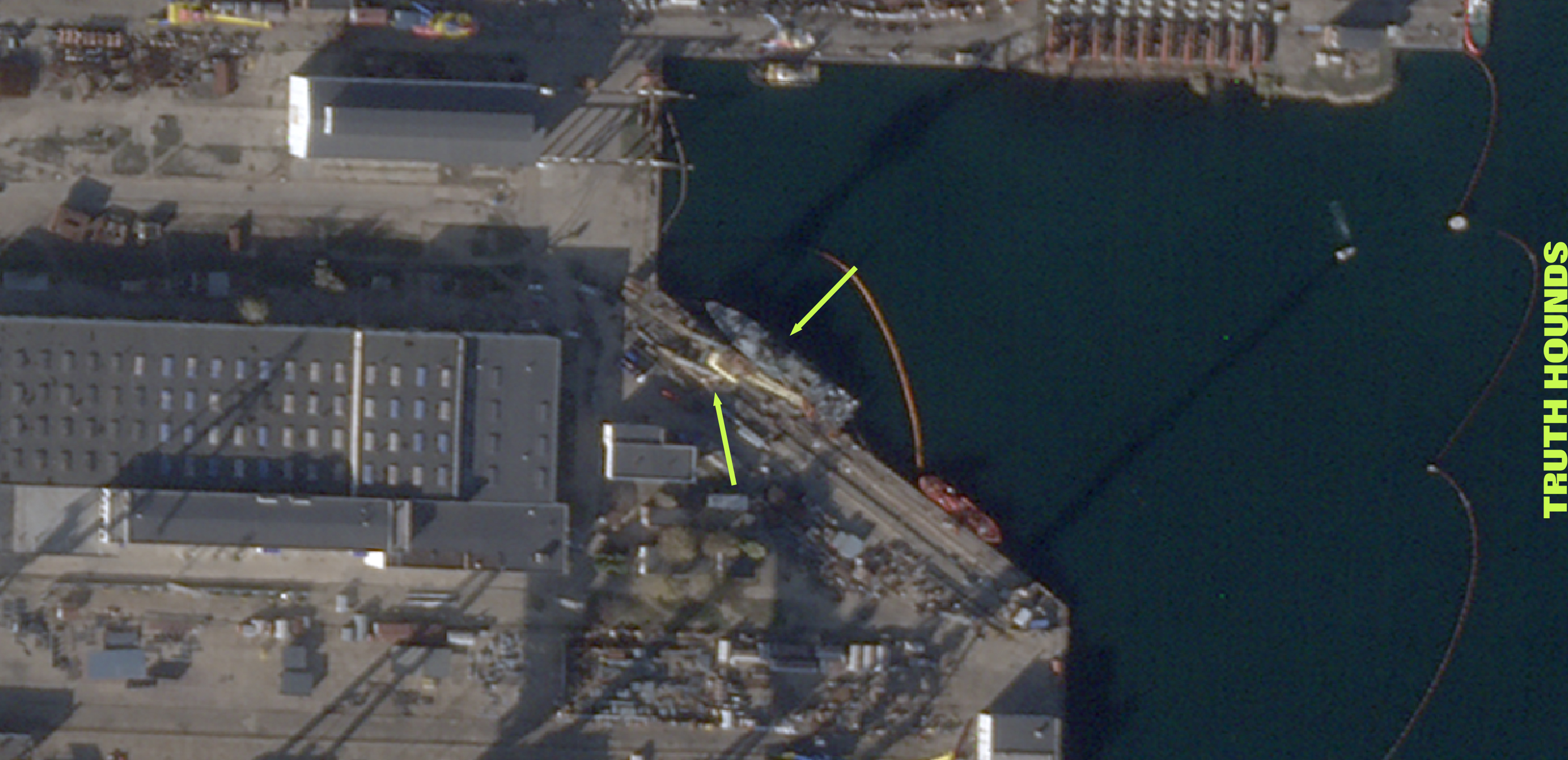 Проект Truth Hounds также публикует спутниковые снимки доков завода «Залив». На снимках за 5 ноября видно, что произошло как минимум одно попадание по кораблю, а для ликвидации последствий перемещен один кран.