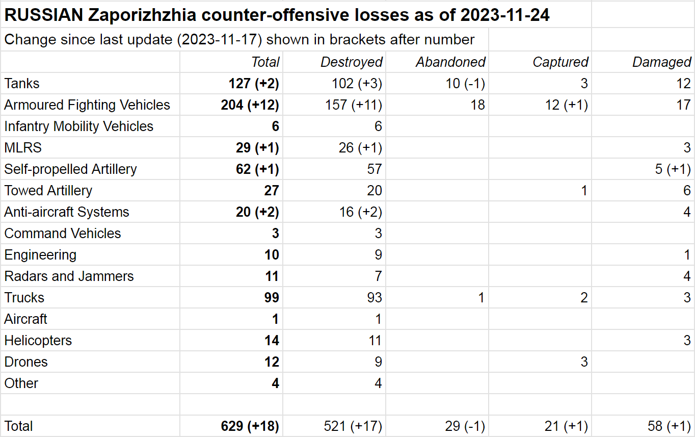 По данным аналитика под ником Naalsio, к 24 ноября подтвержденные потери ВС РФ на запорожском направлении составили 629 единиц военной техники, тогда как ВСУ — 536 единиц. За неделю ВСУ потеряли не менее 9 единиц техники (в том числе два танка и 3 ББМ), тогда как ВС РФ — 18 (включая два танка и 12 ББМ).