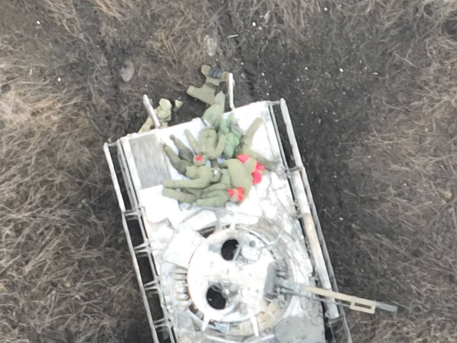Российские военные с неизвестной целью водрузили на подбитую БМП гору «трупов», изготовленных из военной формы, набитой тряпьем.