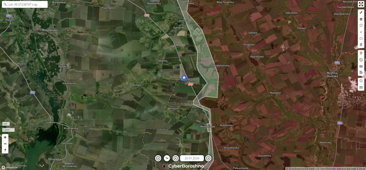 DeepState, рассказывая о ситуации, сложившейся на фронте к концу прошлой недели, отмечает захват ВС РФ села Крахмальное в Харьковской области, а также активизацию на купянском направлении в районе Нововодяного — бои идут к востоку от Тернов и села Диброва.