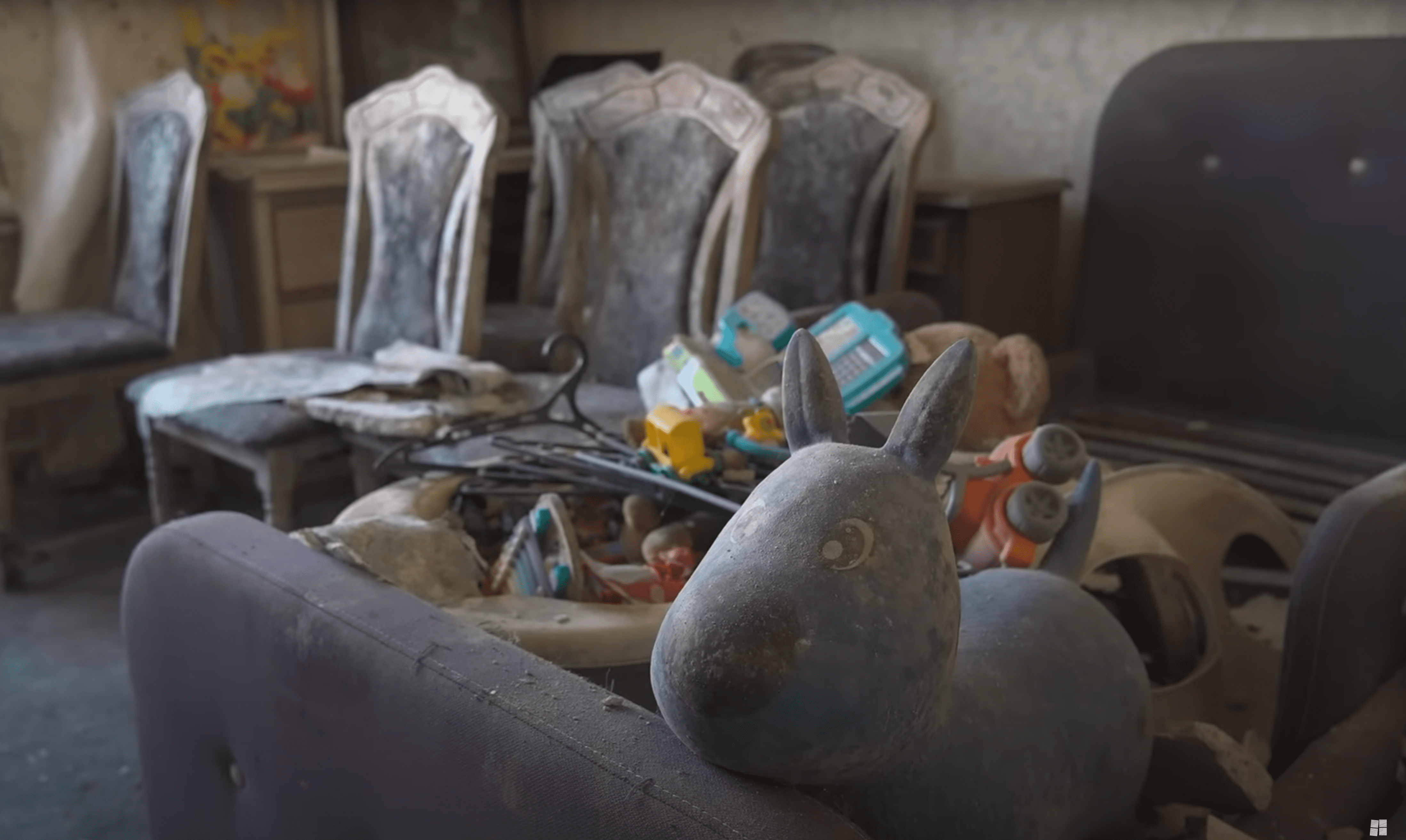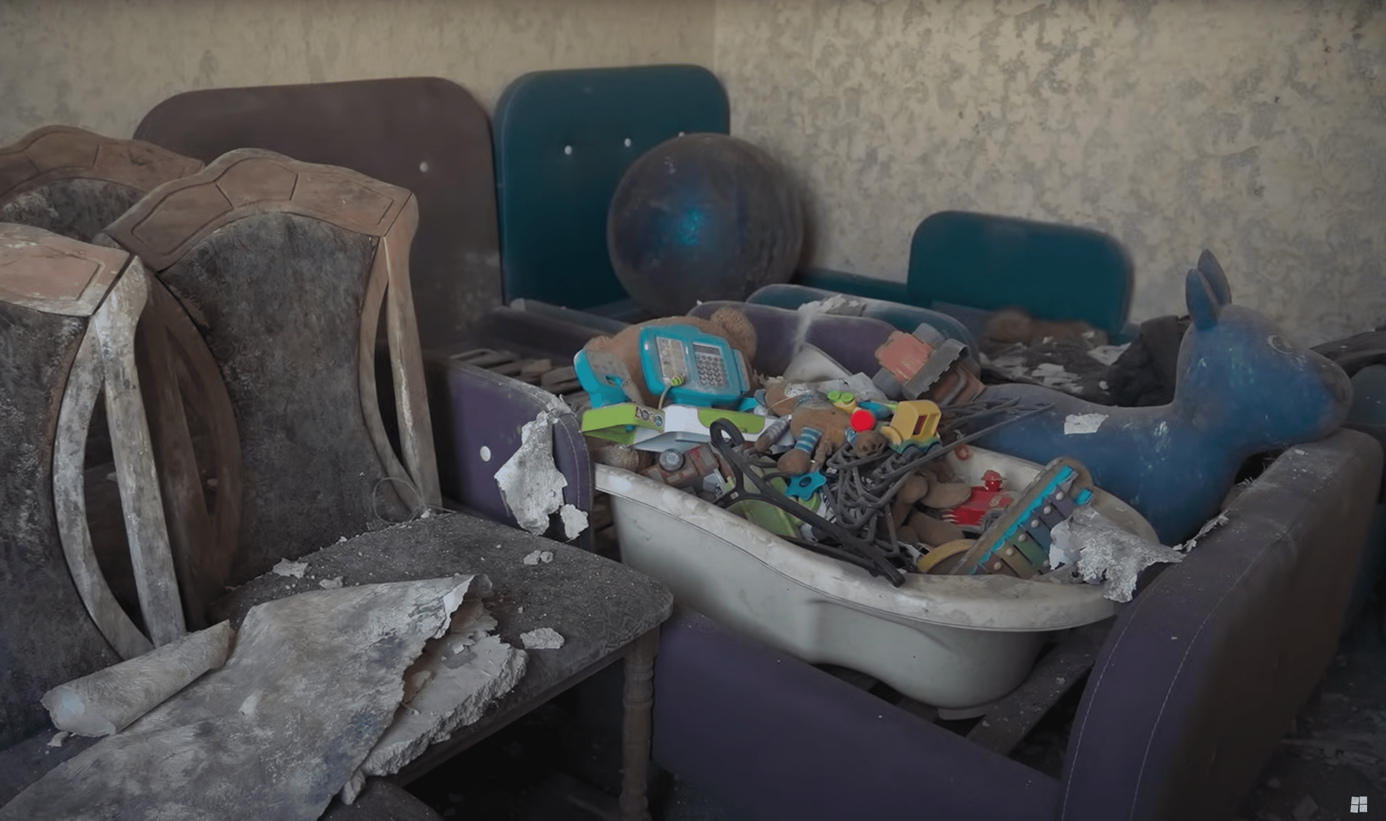 А это детская спальня. Правильной формы, также стеклопакеты поменяны. Здесь ничего не горело. Была разбита крыша, вы можете заметить, что проходила сырость, дожди, появилась плесень, но сейчас дом восстанавливают, реконструируют. Эти вещи теперь можно спокойно убрать. В наше время это не проблема. Мы видим, что собственники квартиры покидали жилье в спешке, оставив всё. Вернуться сюда и убирать — большая трагедия. Люди не могут, они готовы продать вот так, как есть. Новые жильцы должны принять это и делать свой выбор».