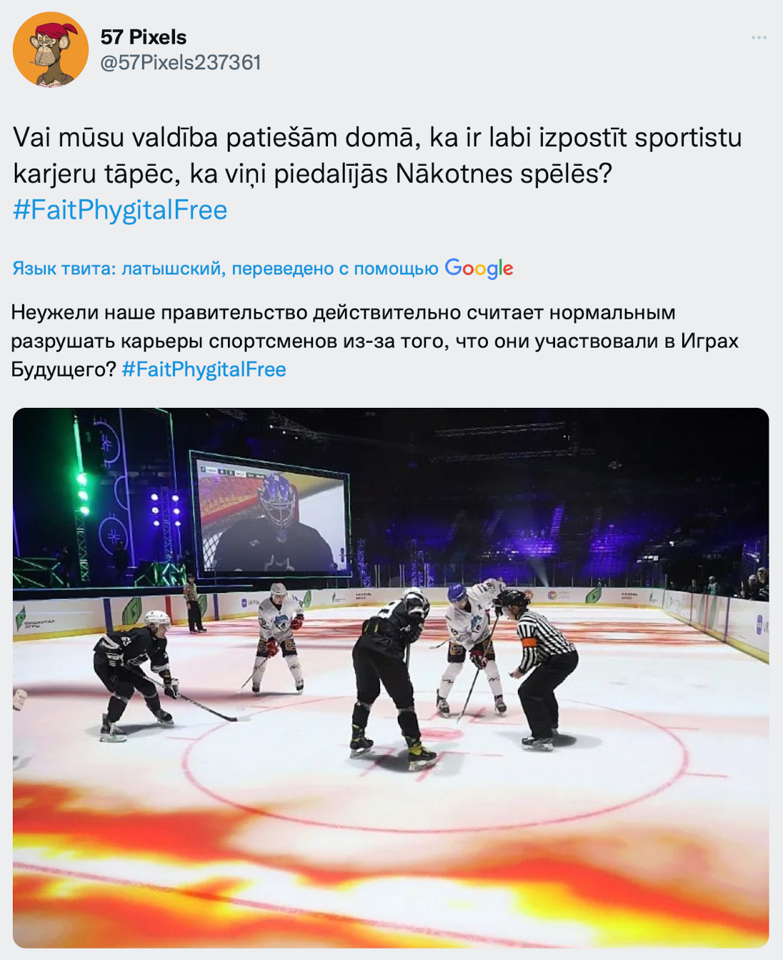 Их активность связана с новостью о том, что Федерация хоккея Латвии (LHF) приостановила лицензии латвийских спортсменов, принявших участие в «Играх будущего» в составе команды BalticSelect, которые состоялись в Казани. Некоторые из них выступали за национальную сборную этой страны.