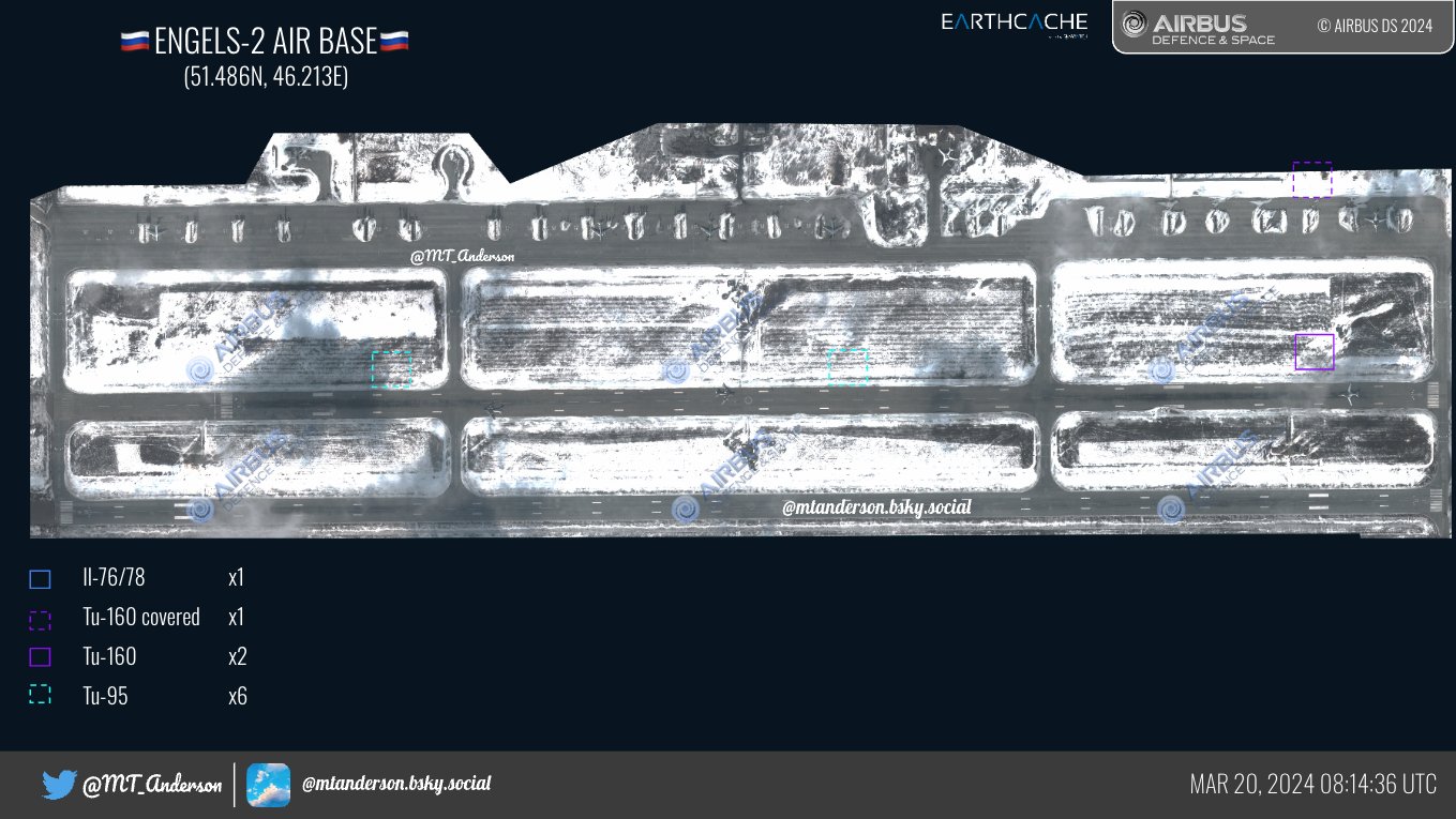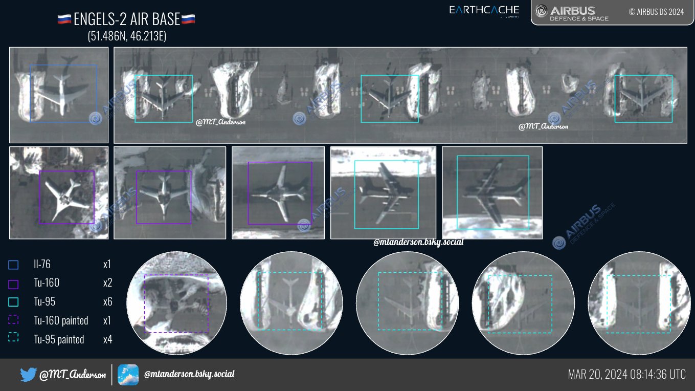 Исследователь под ником MT Anderson публикует спутниковые снимки аэродрома базирования российской стратегической авиации в Энгельсе, накануне атакованного беспилотниками. Никакого ущерба на них не заметно.