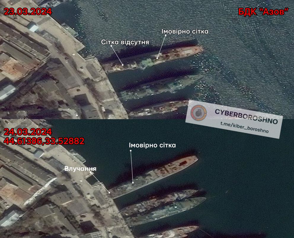 Аналитики украинского OSINT-проекта «КiберБорошно» утверждают, что спутниковые снимки БДК «Азов» свидетельствуют, что он был поражен во время ракетной атаки на Севастополь 24 марта. В частности, заметно, что корабль теперь накрыт маскировочной сетью.