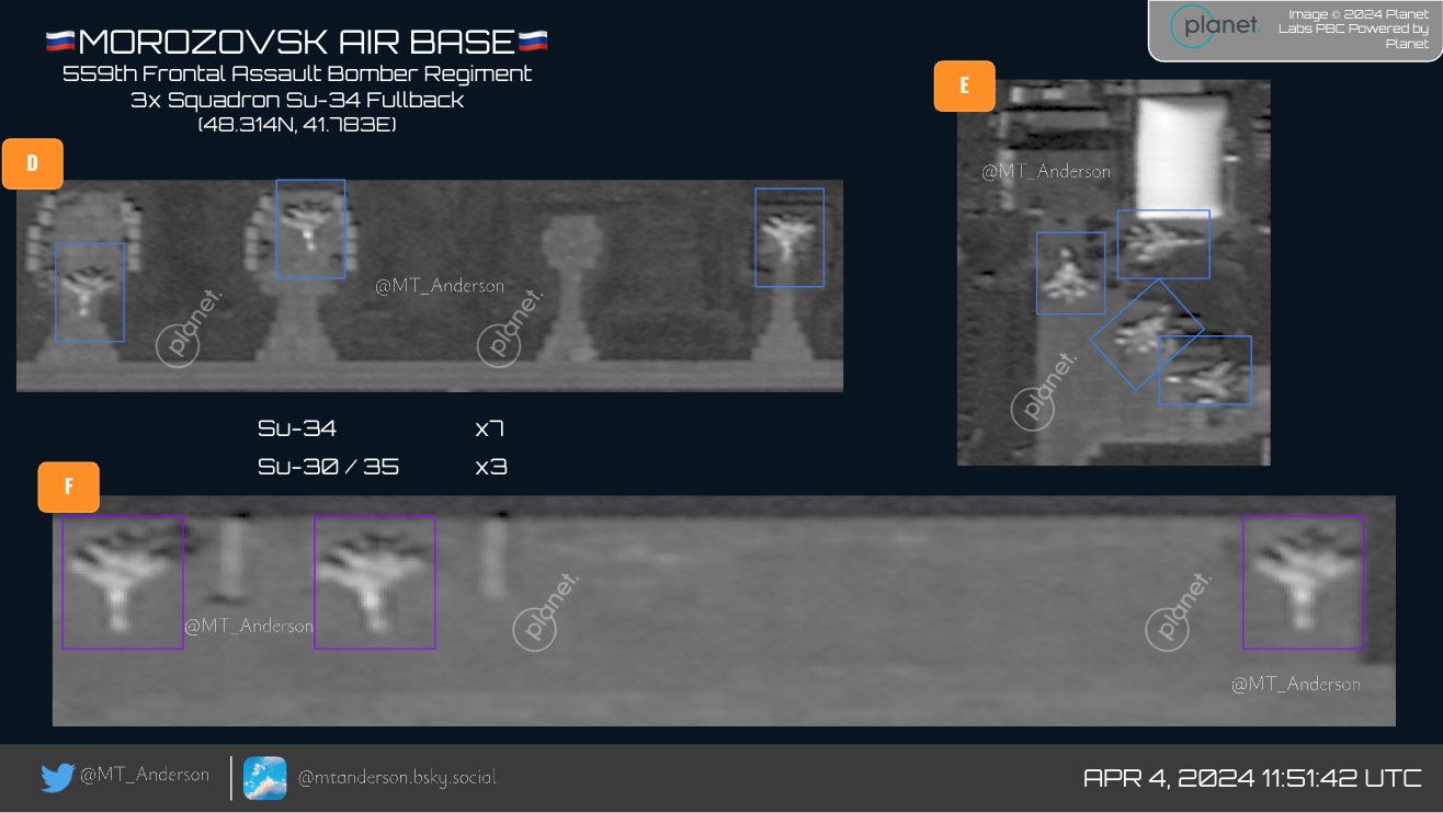 Исследователь MT_Anderson опубликовал спутниковые снимки аэродрома Морозовск, сделанные накануне обстрела. На них он насчитал 26 самолетов Су-34 и три Су-30/Су-35.