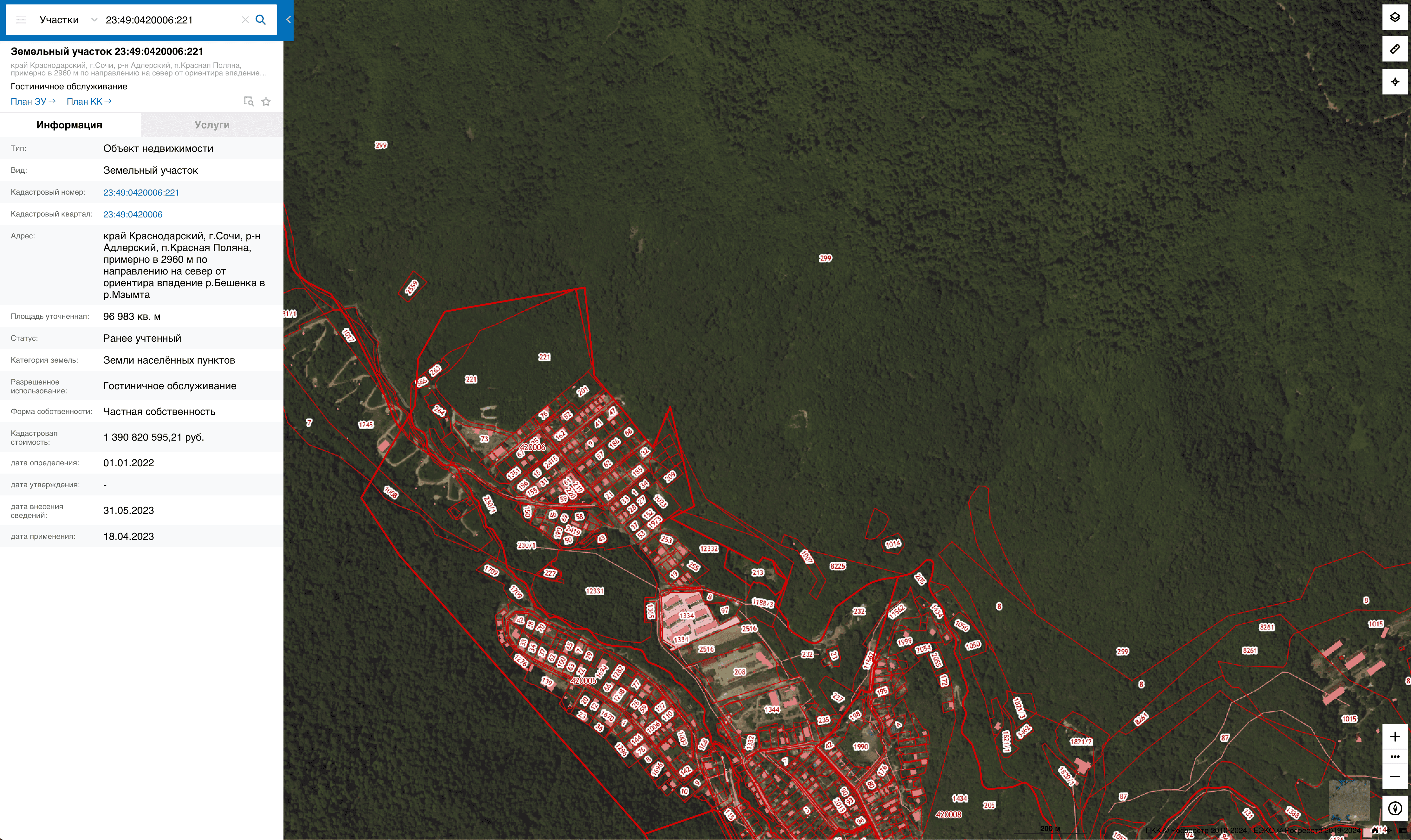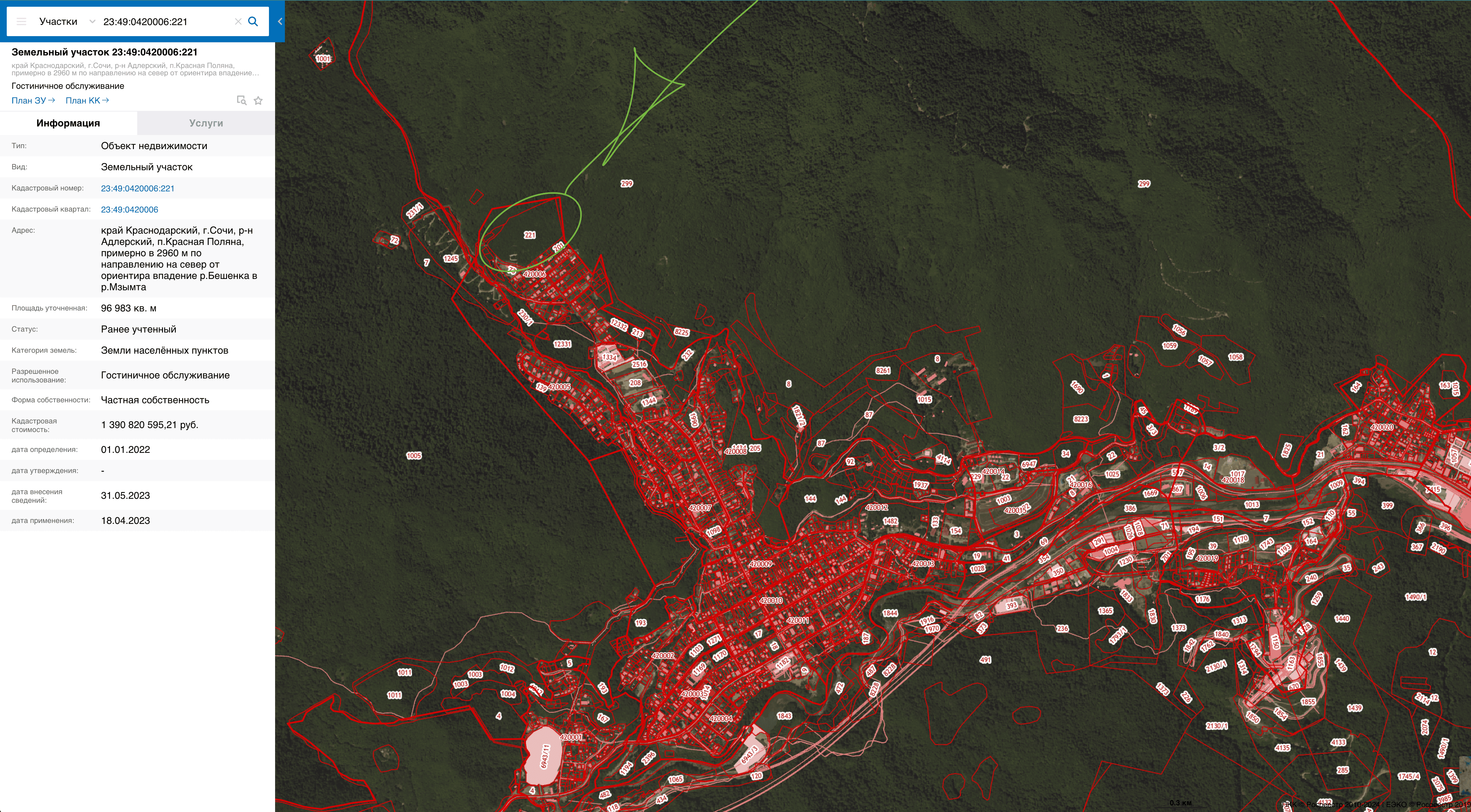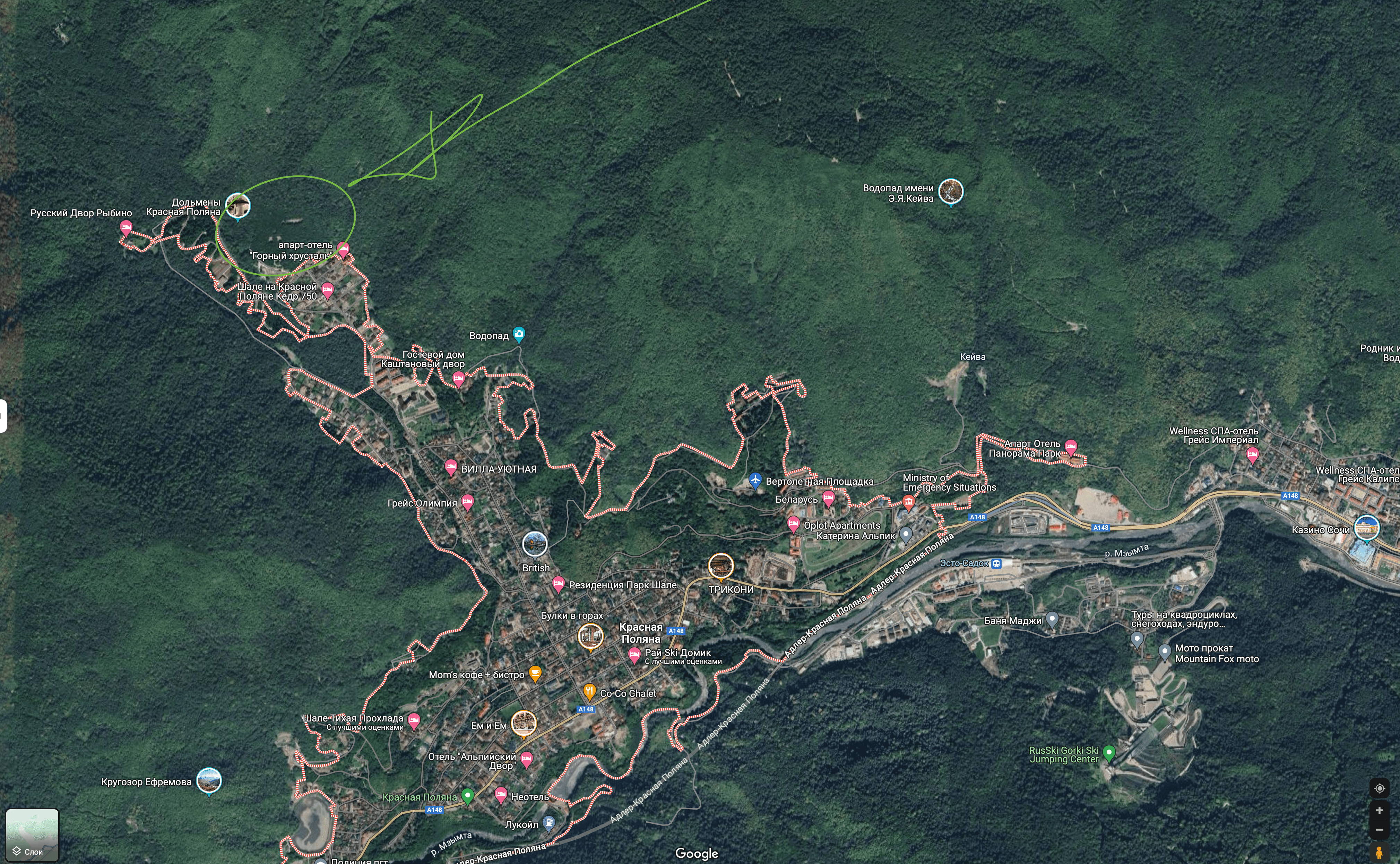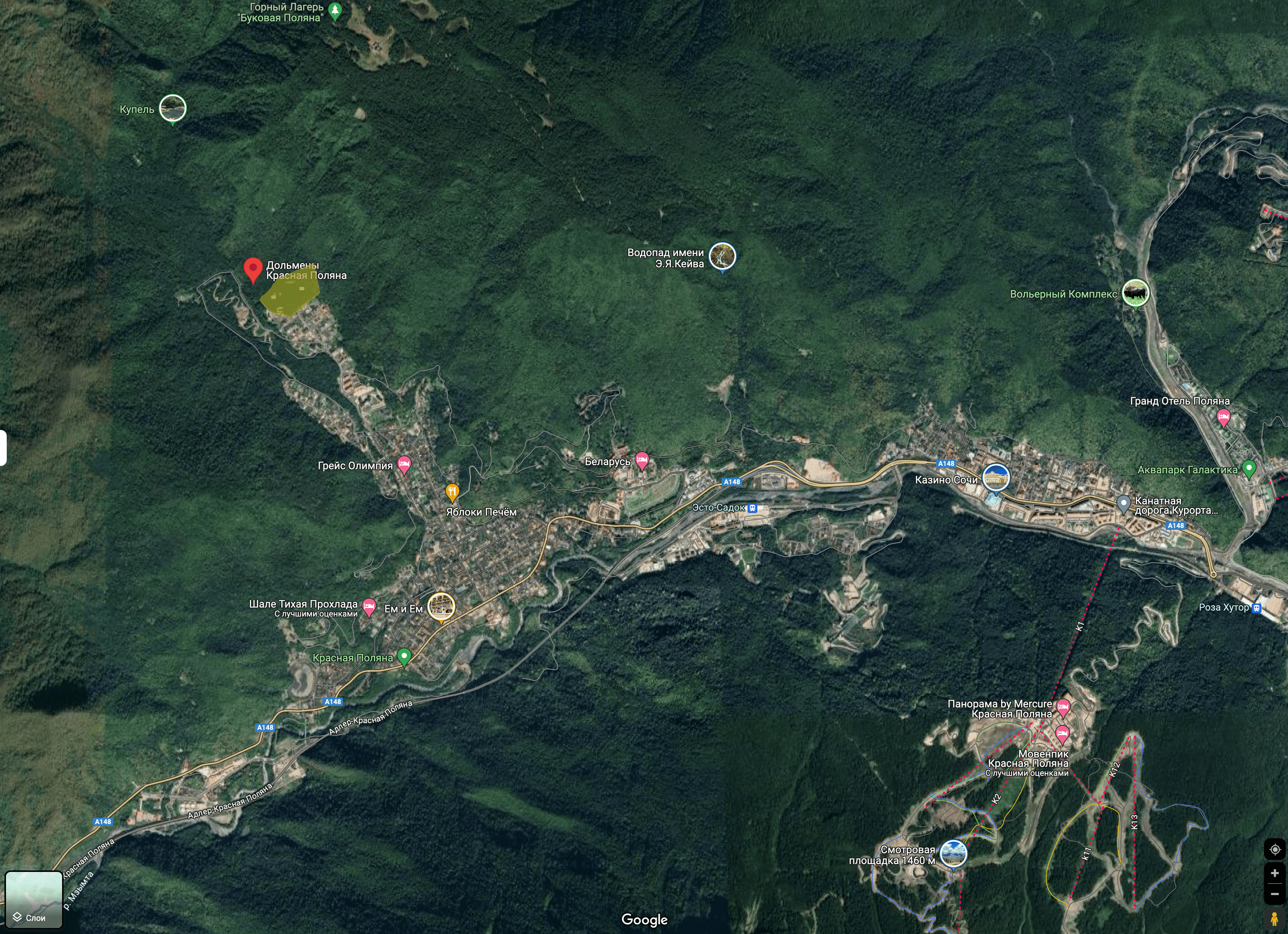 Представить размеры участка и открывающиеся там виды позволяют Google-карты: участок настолько большой, что не исчезает даже при масштабировании на весь Адлерский район Сочи.