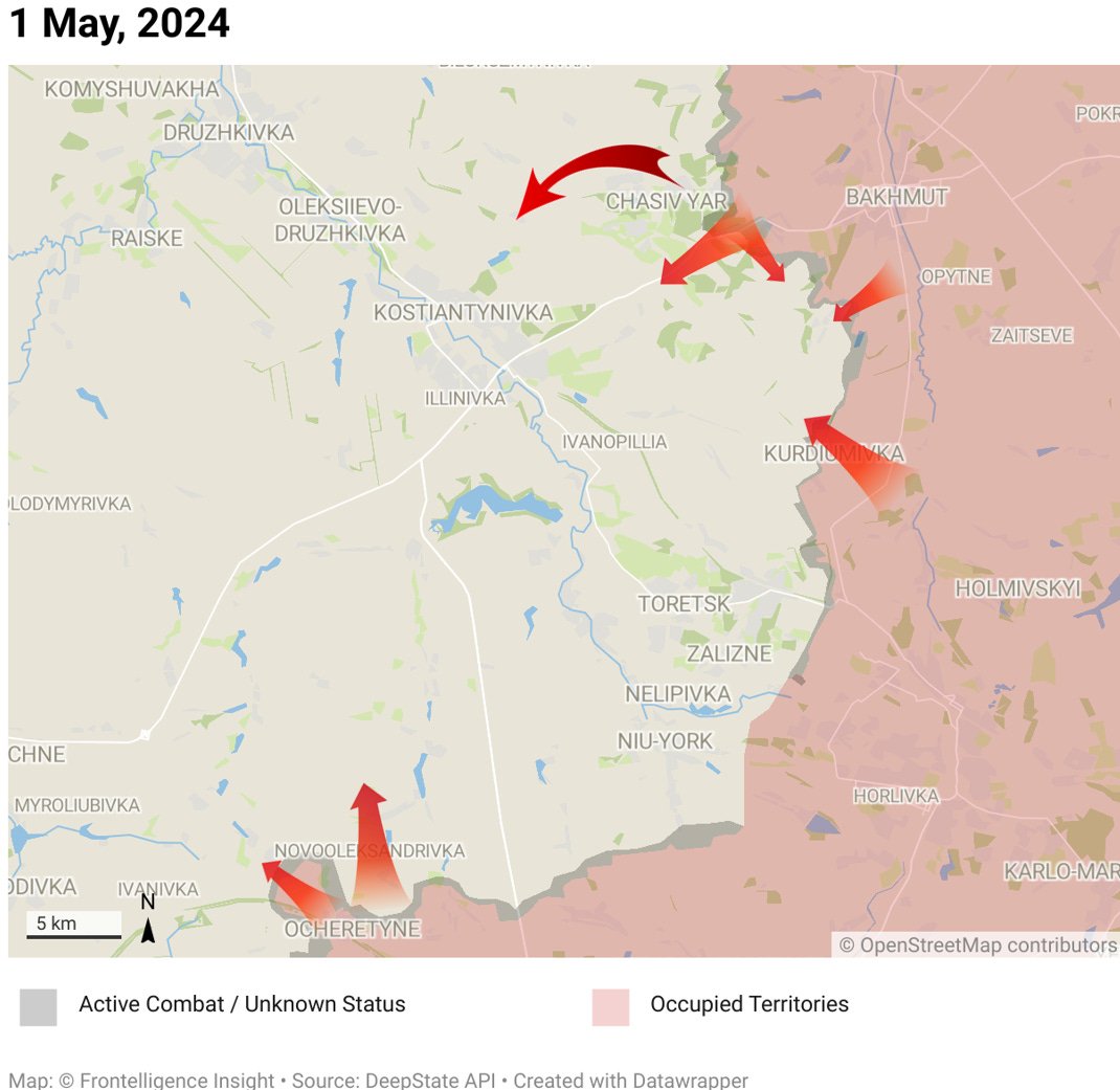 Военный обозреватель издания BILD Юлиан Рёпке пишет, что на прошлой неделе российские военные вошли в Архангельское к северо-западу от Авдеевки и продолжают расширять там плацдарм. К западу от Архангельского они увеличили зону контроля от Соловьёво по направлению к селу Сокол.