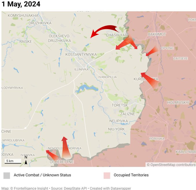 В районе Часова Яра ВС РФ предпринимают попытки зайти в городскую черту с востока и одновременно охватить город с юга, сумев достичь канала Северский Донец — Донбасс и форсировать его. Украинские военные, ведущие оборону, жалуются на засилье российских FPV-дронов, а также потери от «сбросов».