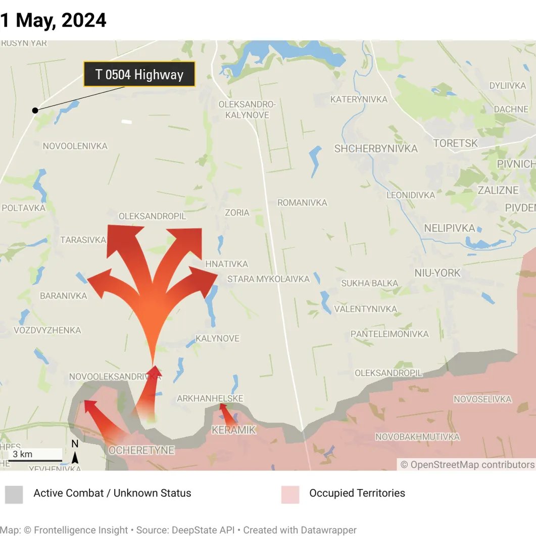 • К северу от Авдеевки продвижение ВС РФ создает угрозу для важной трассы Покровск — Константиновка;