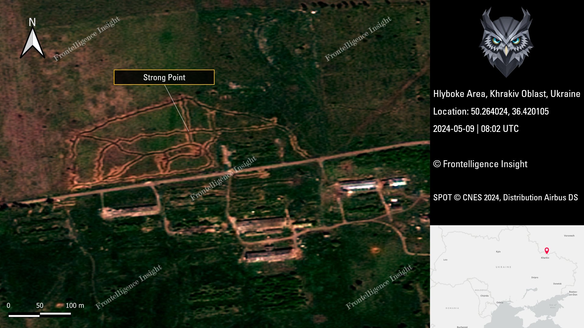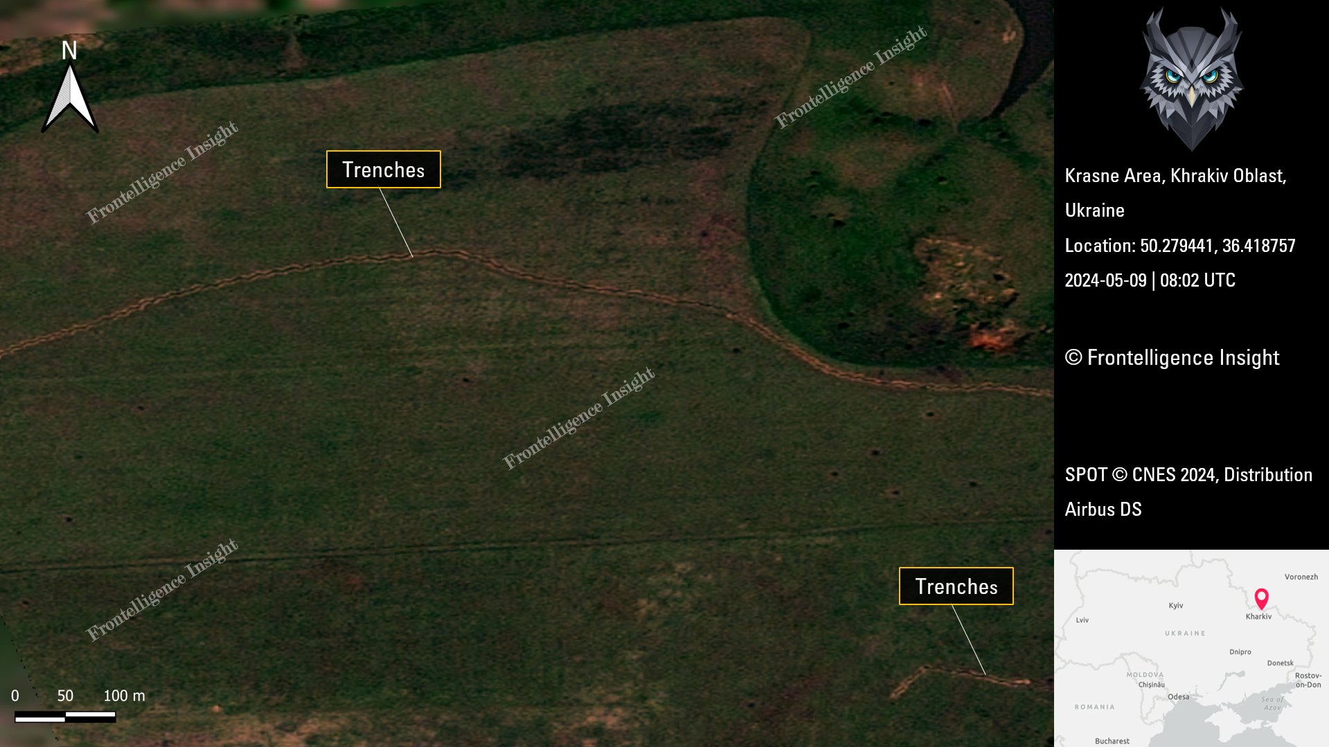 Tatarigami_UA подробно рассматривает один частный вопрос, касающийся отсутствия ИФС в районе продвижения российских войск на севере Харьковской области. При помощи спутниковых снимков исследователь показывает, что рядом с селами Красное и Глубокое по направлению на сам Харьков имелась система траншей и укреплений, а вот по направлению на Волчанск фортификационных сооружений оказалось гораздо меньше.