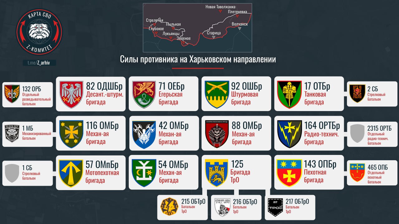 В канале «Z комитет + карта СВО» обращают внимание на то, что все бригады, которые были якобы переброшены ВСУ на север Харьковской области (кроме 125-й бригады Территориальной обороны), представлены только одним батальоном.