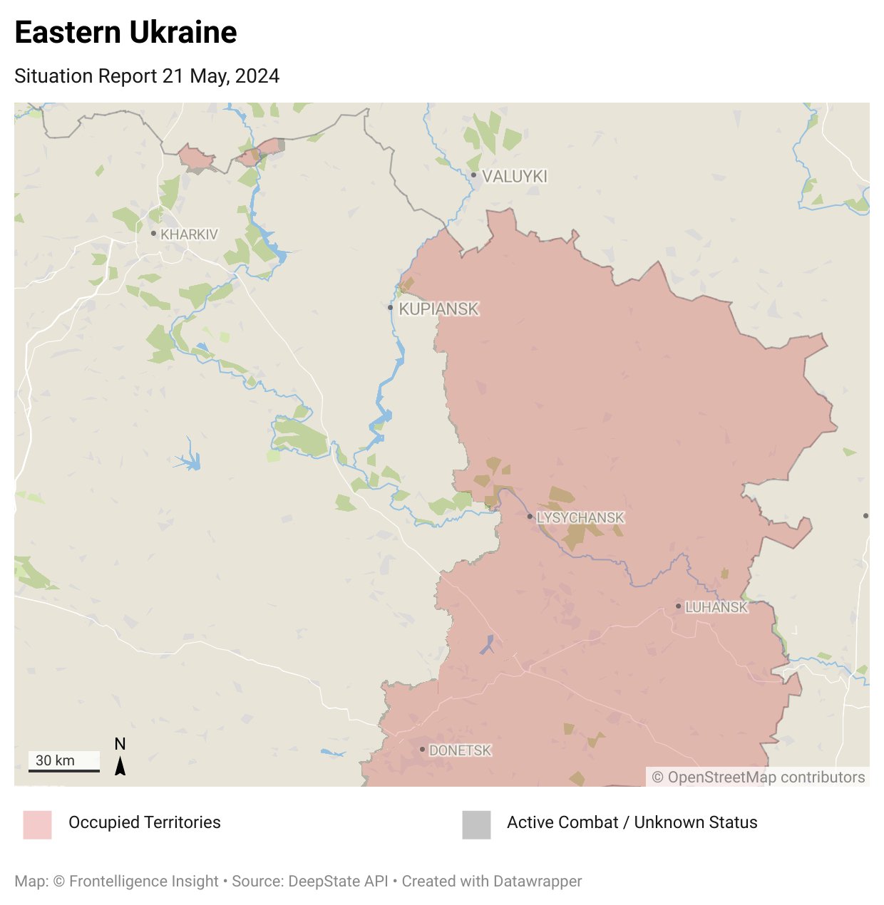 DeepState сообщает о продвижении ВС РФ рядом с Очеретино в авдеевском операционном районе, отмечаются бои в Волчанске на севере Харьковской области и Берестовом к юго-востоку от Купянска, а также в Клещеевке (южнее Бахмута), Уманском (в центре полосы наступления от Авдеевки) и Красногоровке (севернее Марьинки).