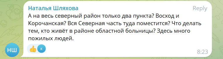Один из крупных белгородских Telegram-каналов «Белгород № 1» опубликовал список 24 пунктов обогрева, которые планируется развернуть в городе в случае перебоев с теплом и светом. В комментариях многие жители выразили недовольство тем, что такие пункты находятся от их домов слишком далеко и могут не вместить всех желающих. Представители администрации города на это отвечали, что стационарные пункты можно открыть только в тех зданиях, где есть генераторы и автономные котельные: