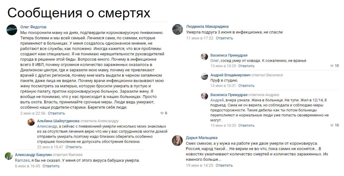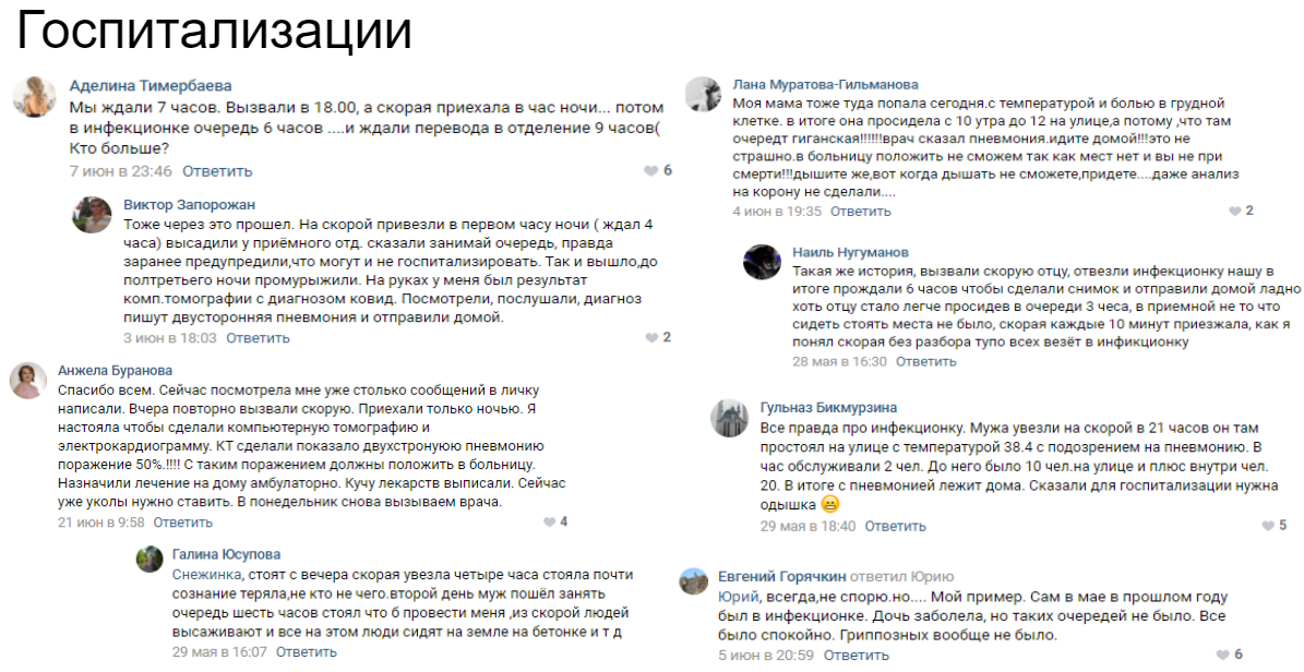 Что пишут люди. Из больниц свидетельств меньше. Те немногие жалобы, которые появляются, касаются перегрузки и, как считают комментаторы, неготовности больниц к эпидемии: «один врач на 5 боксов, к пандемии абсолютно не готовы». «Эта больница вообще не готова. Нам тяжело дышать, порою открывается удушье, у них 3-4 кислородные подушки и 1 либо вообще нет в отделениях кислородных масок. Про кислород мы вообще молчим. Они только сейчас (16.06) начали проводить кислород, в то время как мы лежим с 6.06.2020г.».