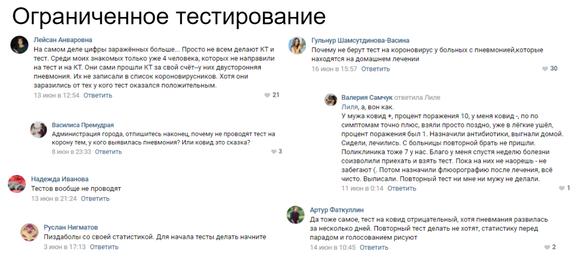 Что пишут люди. В поликлиниках поголовно ставят один диагноз: «ОРЗ» — и отправляют домой. О COVID не идёт речи. Никаких предписаний или хотя бы рекомендаций о самоизоляции. Многим не делают тесты: десятки жалоб на то, что «тестов вообще не проводят», даже «тем, у кого выявилась пневмония». Много жалоб на невозможность сделать КТ: в платных клиниках цены выросли в разы, очереди — на 1−3 недели вперёд, часть людей едет или везёт близких на КТ в соседние города: в Заинск и Нижнекамск.