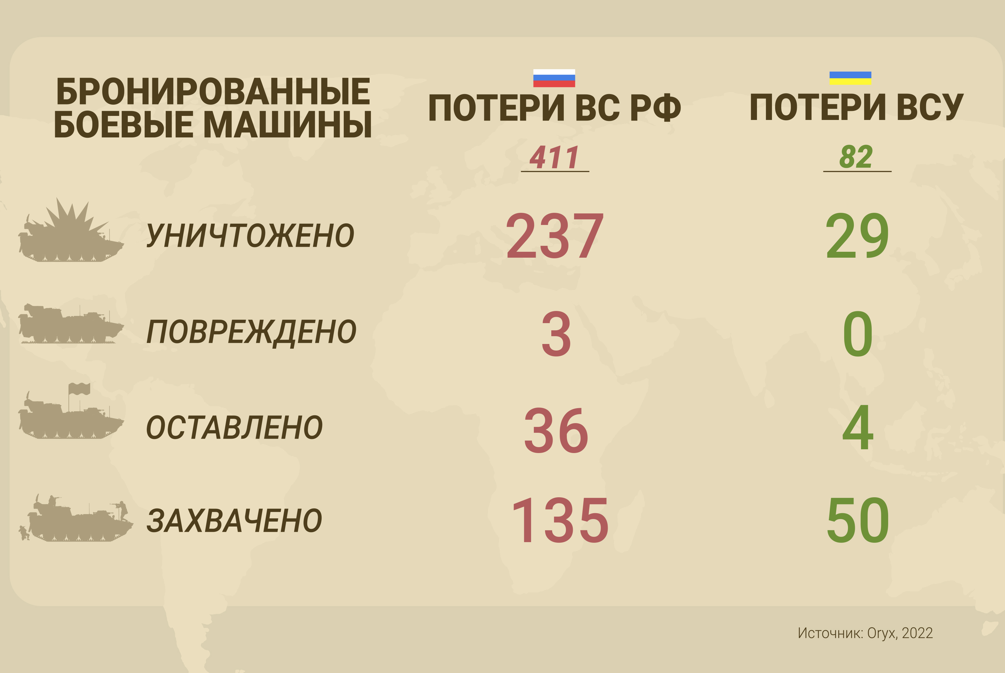 ВС РФ потеряли свыше 700 танков (в том числе более 200 самых массовых — Т-72Б3), из них только 400 уничтожили или повредили в бою, остальные пополнили ряды украинской армии. До половины и более потерь по другим категориям бронетехники также приходятся на оставленные и захваченные машины. Известные потери ВСУ на порядок меньше.